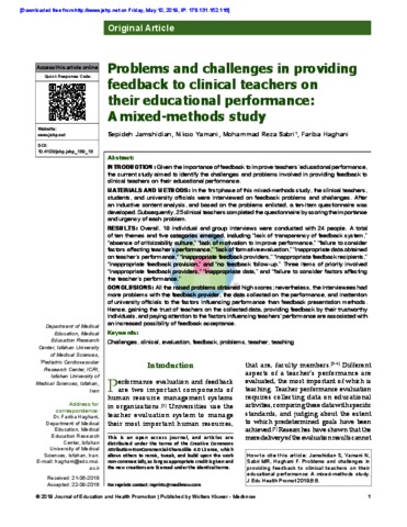 (2019) Problems and challenges in providing feedback to clinical teachers on their educational performance: A mixed-methods study. J Educ Health Promot. p. 8. ISSN 2277-9531 (Print) 2277-9531 (Linking)